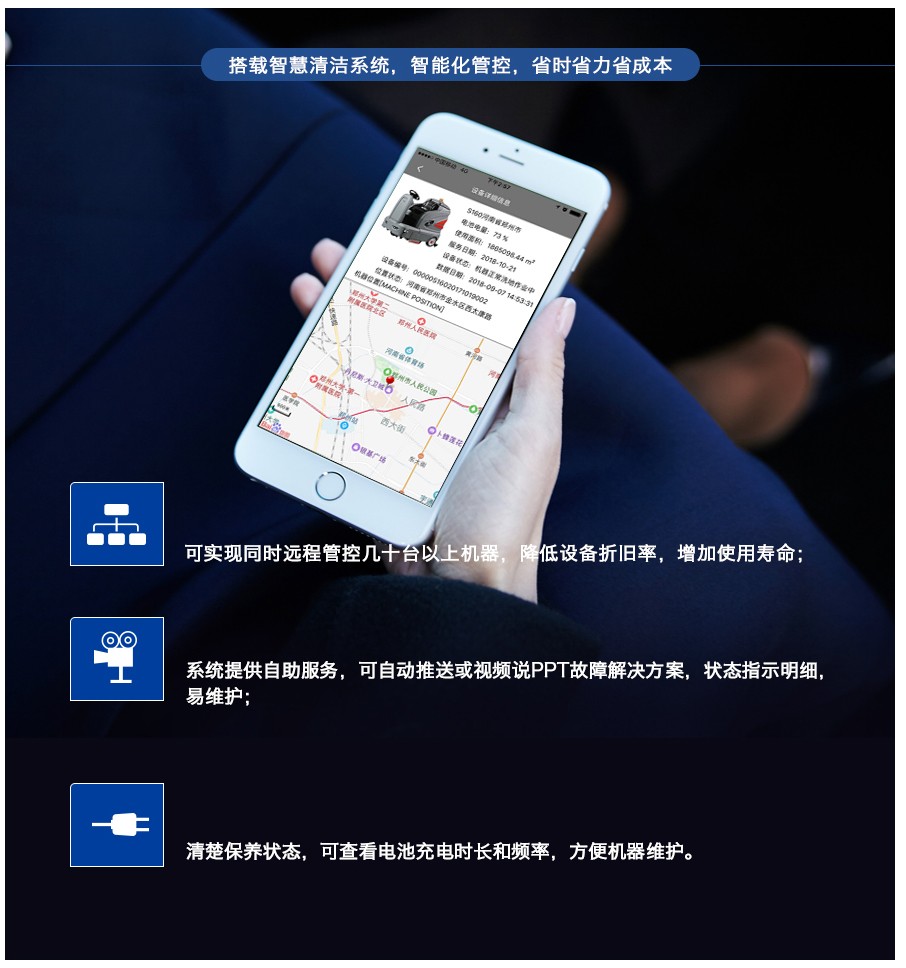 用途:S160智慧型洗地車,智慧機型,效率典範,中大面積場所的适配機型。适用于所有硬地面清潔,每小時工作效率6800平方米,快速清潔,提高工作效率。