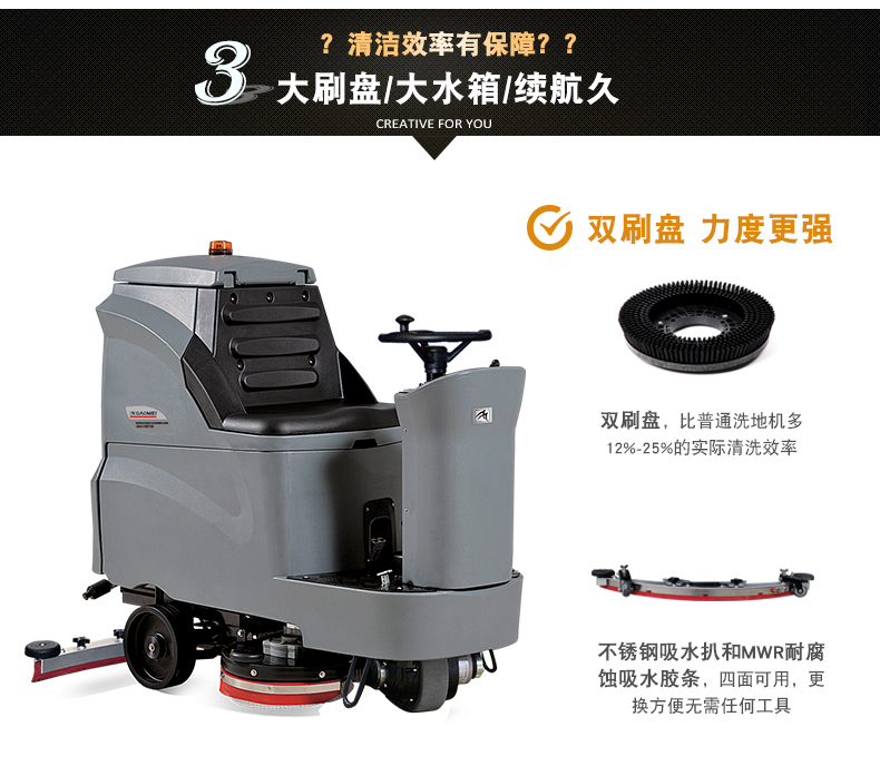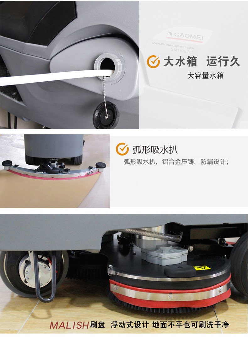 高美GM110BT85中大型駕駛式洗地機,可進電梯,勝任多樓層作業。洗擦、吸幹一次性完成,适用于1000㎡-20000㎡場所使用,工廠、車間、倉庫、醫院、學校、商超等。